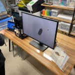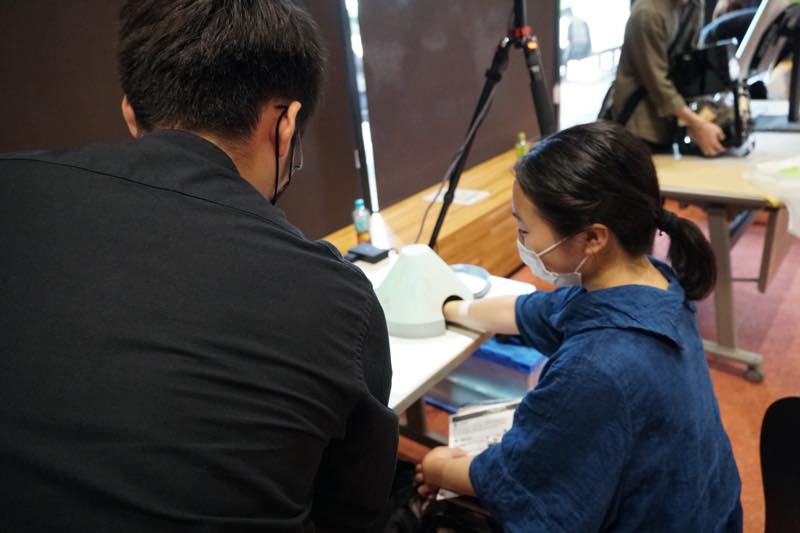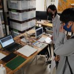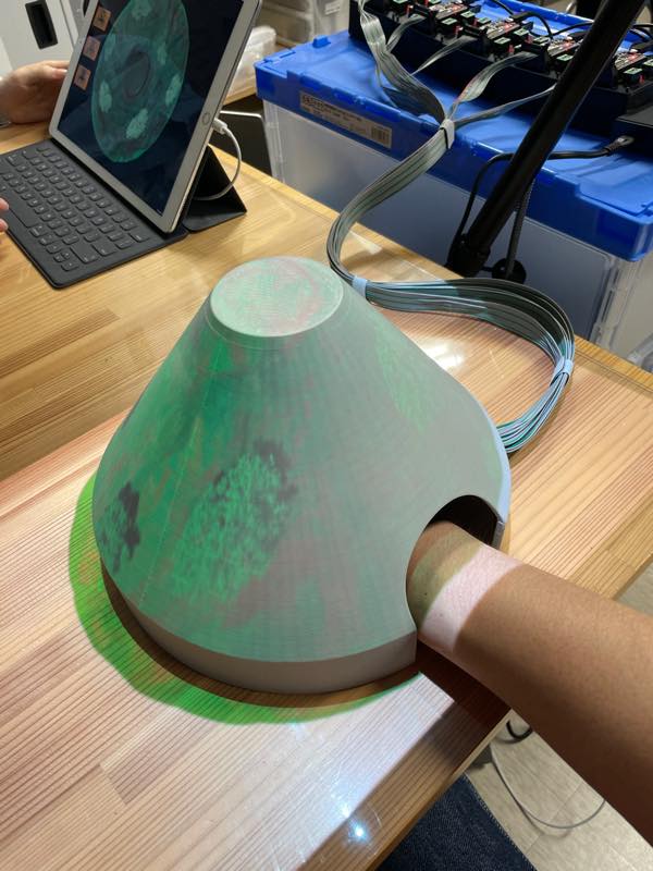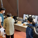 これらについて、6月6日(月)は、主に情報理工学部の学部内向けの展示として、14号館1Fのファブスペース RE:DIRECTIONにて展示しました。また、6月7日(火)は京産大の他学部の学生や教職員向けに、天地館1Fのロビーにて展示しました。その時の様子(写真)を以下に載せます。学部内および他学部、教職員の方々にいろいろと体験してもらいました。特に、人類山化計画は、VR作品であるため、自身で体感しないとその面白さがわからないのと共に、国内外で幾つも受賞した作品である点も知ってもらうべく展示しました。他の2点については、研究として製作しているものであり、その研究背景や成果自体を知ってもらうための展示でした。