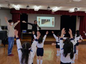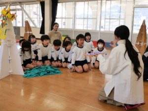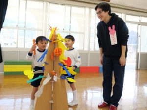 3Dプリンタによる実演では、キャンパスから持参した3Dプリンタを用いて、園名である「す」「み」「れ」を実際にそれぞれ造形し、その様子を園児に観察してもらいました。3Dプリンタの名称を知っている園児は数人いたものの、実際に稼働する様子を初めて見る園児たちは、それぞれの文字が造形される様子を興味津々に見ていました。また、ファブスペースと情報理工学部の学生らが考案した、小さな子どもでもデジタル工作機器がわかるように体を動かしながら学べる「デジタル工作機械体操」も行いました。普段目にする機会のないデジタル工作機器の動きを真似ながら、園児らは楽しく体を動かしていました。