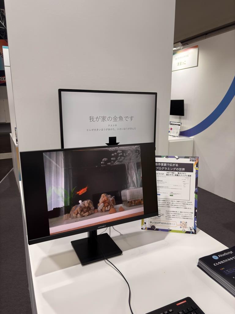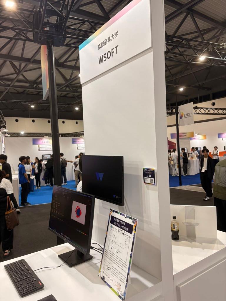 上村君は、クリエイティビティ部門での展示で、チーム名:WSOFT として個人で開発している「AliceScript」を作品として応募し、展示を行いました。AliceScriptは上村君の自作言語で、.NET上で動作するスクリプト言語です。万博の展示会場では、AliceScriptでどのようなプログラムが書けるのか、その具体的な例をいくつも用意して展示に臨んでいました。上村君本人のblogでの報告記事もあり、ミャクミャクを描画するプログラム例など出てますので、ぜひそちらもご覧ください。