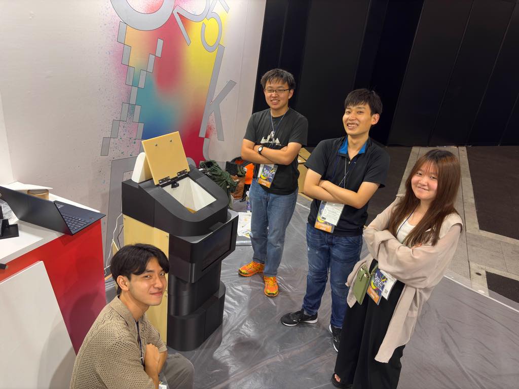 井上さんはヒューチャー・インパクト部門での展示で、チーム名:sCAvenTure として他大学の学生達と共に製作した作品「ゴミ箱使用者と交流する、意思を持ったねこ型ゴミ箱ロボット」を展示しました。大型のねこ型ゴミ箱ロボットを3Dプリンタやセンサ、マイコン等を用いて製作し、実際にゴミを投入した際の動作などをデモ展示していました。