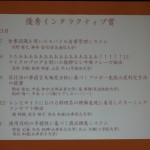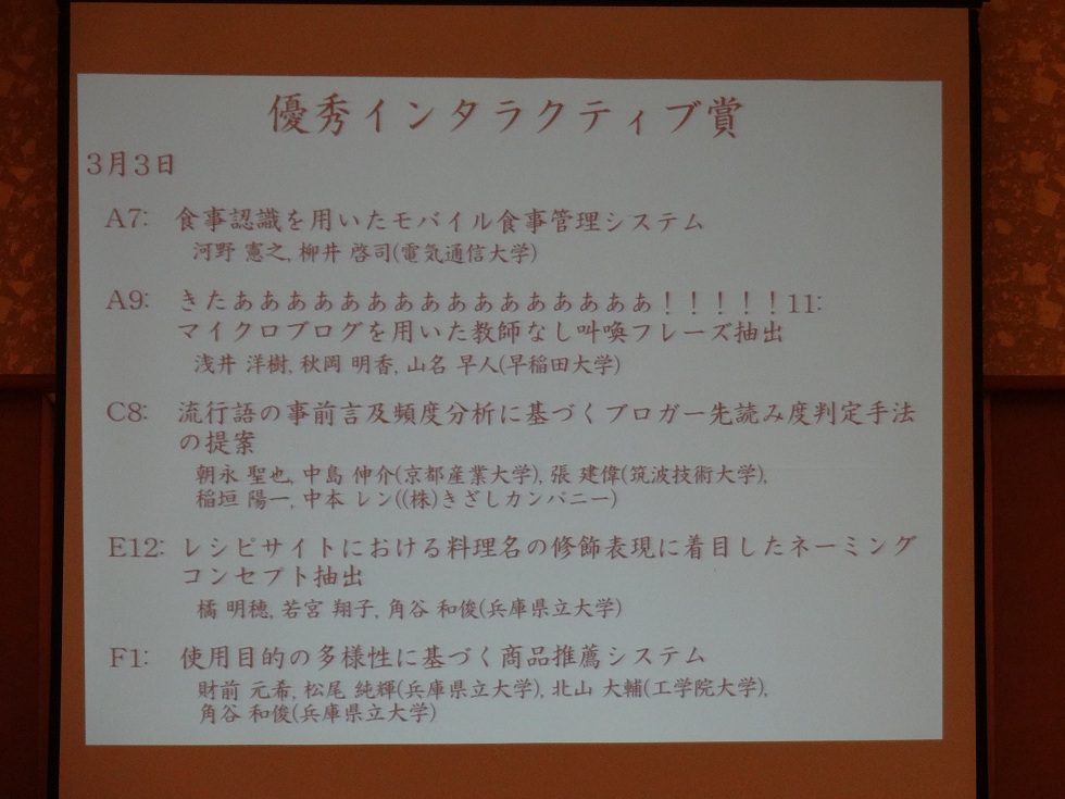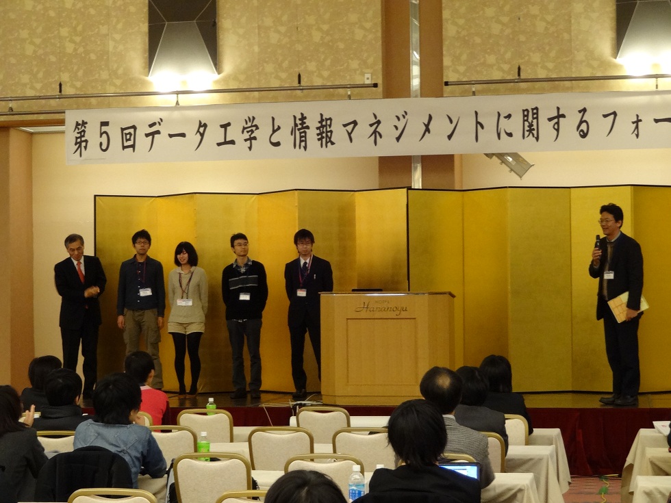 2013年3月3〜5日に行われた第5回データ工学と情報マネジメントに関するフォーラム(電子情報通信学会データ工学研究専門委員会 主催)において、B4朝永聖也君(中島研)達の発表が、「優秀インタラクティブ賞」を受賞しました!