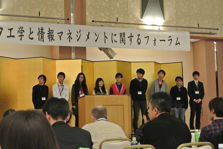 2013年3月3〜5日に行われた第5回データ工学と情報マネジメントに関するフォーラム(電子情報通信学会データ工学研究専門委員会 主催)において、B4日高智貴君(河合研)達の研究発表が、「学生プレゼンテーション賞」と「優秀インタラクティブ賞」をダブル受賞しました!