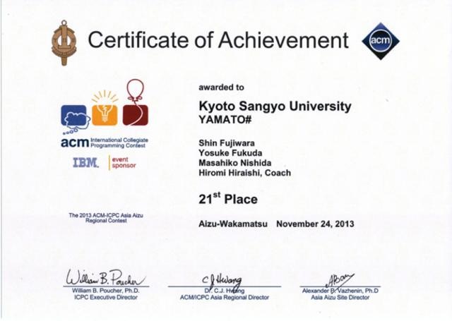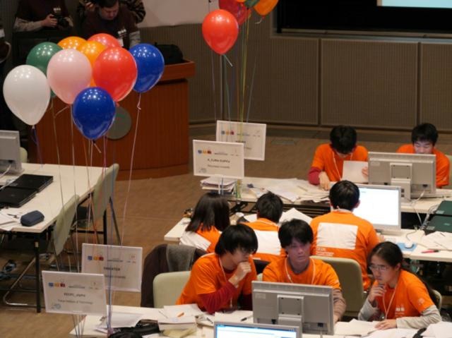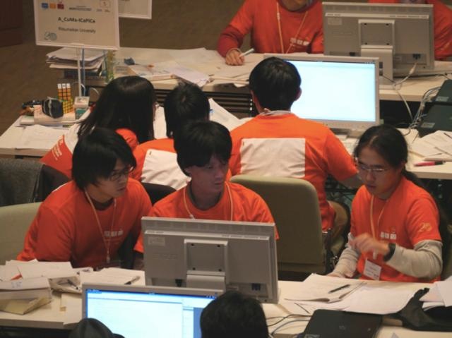 7月12日に行われたACM-ICPC (国際大学対抗プログラミングコンテスト)の国内予選を突破した4回生メンバー3人のチーム YAMATO# は、11月23日~25日に会津大学で開催されたアジア地区予選に参加し、5時間にわたる奮闘の末10問中4問に正解しました。33校から40チーム(内海外から6校6チーム)が参加し、大学ランキング21位、チームランキング27位の成績をおさめました。本学からアジア地区予選へ進出したのは久々のことですが、アジア地区予選で4問正解したのは初めてのことで快挙と言えます!