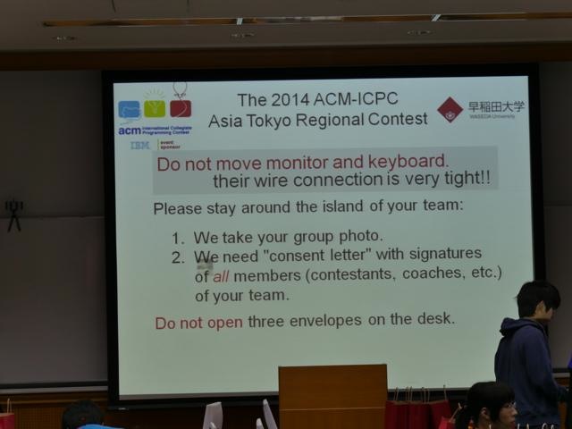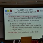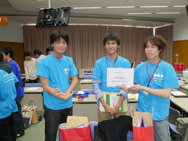 7月11日に行われたACM-ICPC (国際大学対抗プログラミングコンテスト)の国内予選(72大学から326チームが参加)を突破した先端情報学研究科修士課程1年次生2人とコンピュータ理工学部3年次生1人からなるチームTeraCodersは、10月18日~20日に国立オリンピック記念青少年総合センターで開催されたアジア地区予選東京大会に参加し、5時間にわたる奮闘の末11問中4問に正解しました。34校から40チーム(内海外から5校5チーム)が参加し、大学ランキング22位、チームランキング27位の成績をおさめました。先端情報学研究科/コンピュータ理工学部のチームがアジア地区大会に参加するのは昨年に引き続き2回目で、2年連続の快挙達成です。