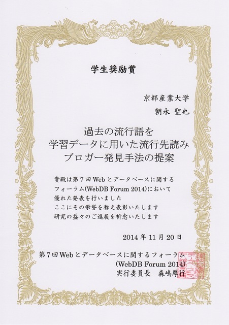 第7回 Webとデータベースに関するフォーラム(WebDB Forum 2014)が、平成26年11月19日(水)~20日(木)の日程で、東京都江東区(芝浦工業大学・豊洲キャンパス)にて開催され、約300名が参加した。先端情報学研究科M2朝永聖也君(中島研究室)の論文発表が学生奨励賞を受賞しました。