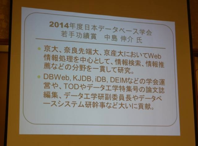 日本データベース学会の活動に多大な貢献をしてきたとして、中島先生が同学会より若手功績賞を受賞しました。授賞式は、第7回データ工学と情報マネジメントに関するフォーラム(DEIM2015/第13回日本データベース学会年次大会)にて行われました。