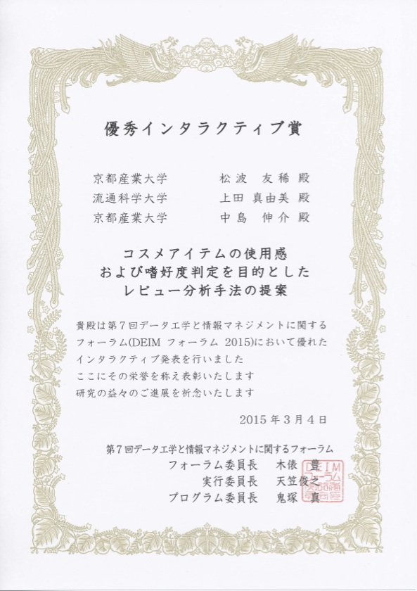 松波 友稀 (京産大), 上田 真由美 (流通科学大), 中島 伸介 (京産大) - 学生プレゼンテーション賞