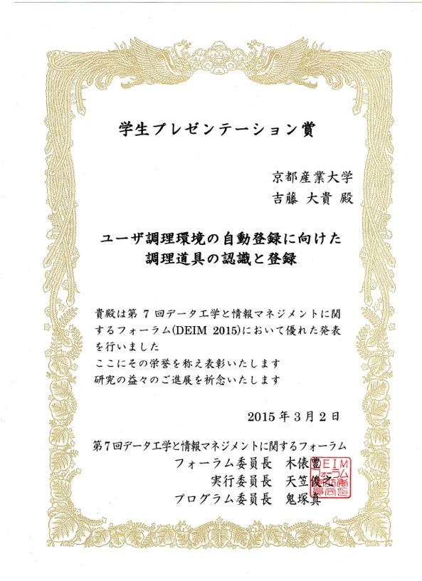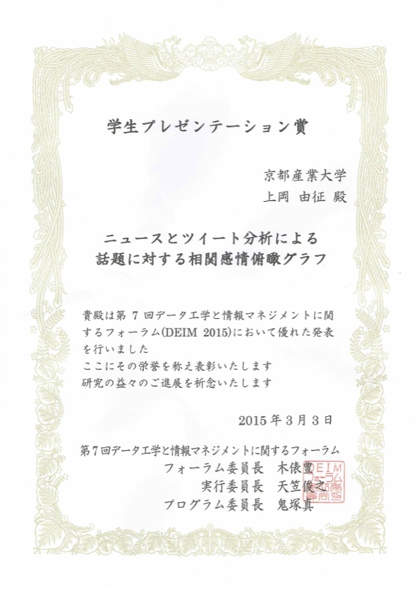 第7回データ工学と情報マネジメントに関するフォーラムDEIM Forum 2015(第13回日本データベース学会年次大会)で、本学部および先端情報学研究科から多数の研究論文が発表し、4件の賞を受賞しました!