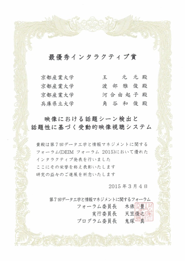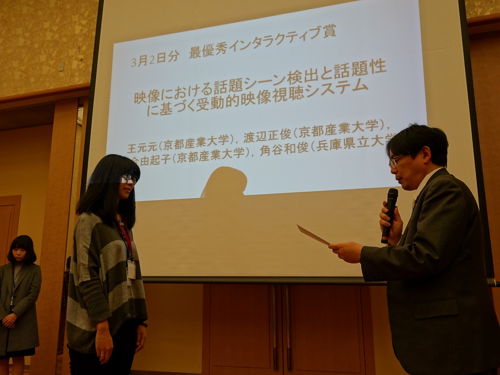 王 元元, 渡部 雅俊, 河合 由起子(京産大), 角谷 和俊 (兵庫県立大) - 優秀インタラクティブ賞