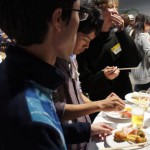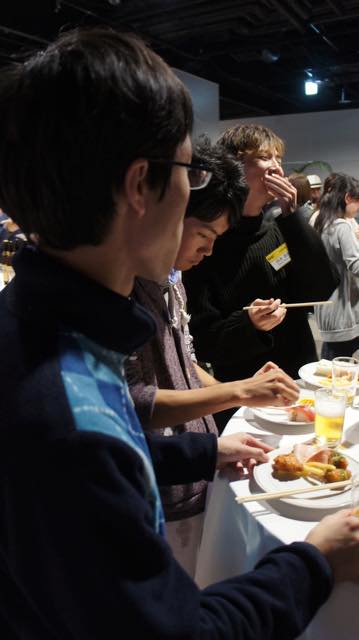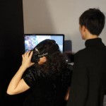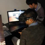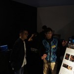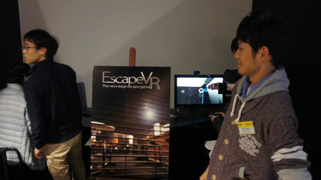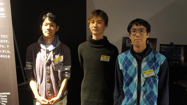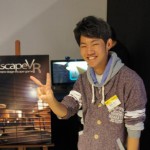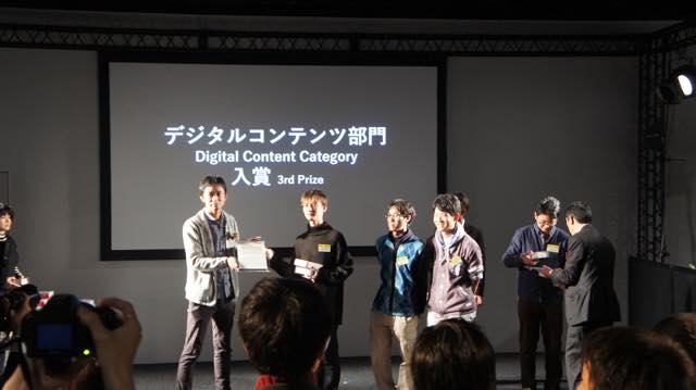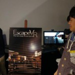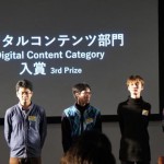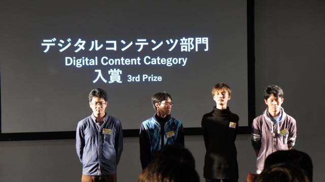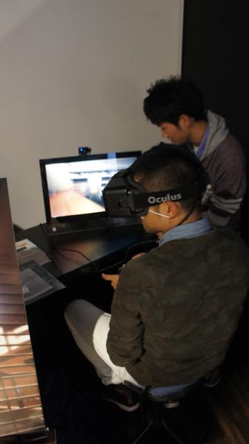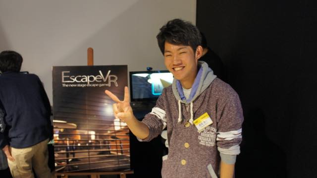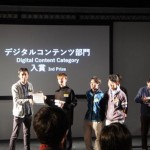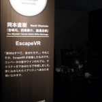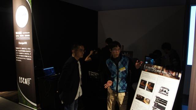 コンテストは国内映像部門、海外映像部門、デジタルコンテンツ部門に分かれており、岡本君達の作品はデジタルコンテンツ部門として応募しました。デジタルコンテンツ部門については、応募作品の中からノミネートされた作品だけが、11/9(水)、11/10(木)の二日間、グランフロント大阪北館のEvent Lab.にて、展示する機会を与えられました。そして、展示中に審査員が訪れて作者達が自身の作品プレゼンと質疑応答をすることで最終審査が行われました。EscapeVRは、そのプレゼン結果から入賞となりました。なお、展示の場では、日本人だけでなく海外からの審査員や受賞者達も展示ブースに来訪し、岡本君達は英語での説明も行いつつ、ヘッドマウントディスプレイを装着してもらっての作品の体験をしてもらっていました。