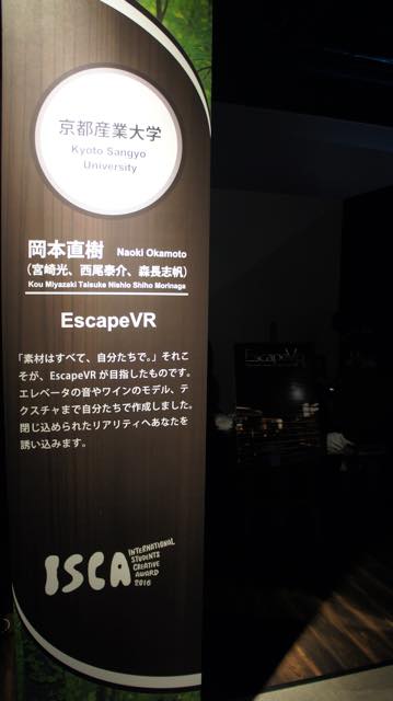 国内外の大学や大学院、専門学校の学生を対象としたクリエイティブ作品のコンテスト International Students Creative Award 2016 (ISCA2016) において、本学部の学生達(B2岡本直樹君、B3宮崎光君、B2西尾泰介君、B2森長志帆さん)のVR脱出ゲーム作品「EscapeVR」がデジタルコンテンツ部門で入賞しました。