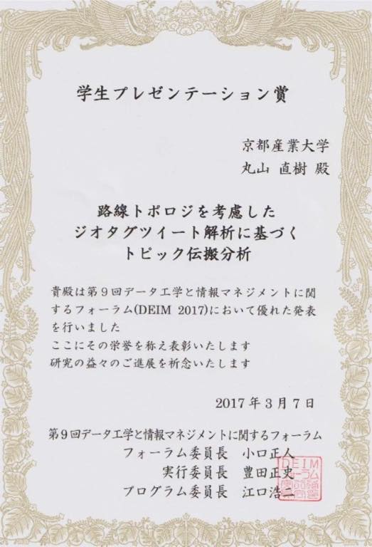 2017年3月6日〜8日に開催された「第9回 データ工学と情報マネジメントに関するフォーラム」(DEIM 2017)にて、本学大学院先端情報学研究科修士2年生の丸山直樹君(河合研究室)が学生プレゼンテーション賞を受賞しました(写真の右から2番目が丸山君)。