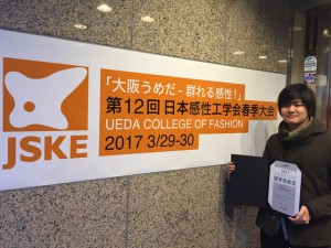 第12回日本感性工学会春季大会が、2017年3月29日(水)~3月30日(木)の日程で、大阪の上田安子服飾専門学校にて開催され、本学 先端情報学研究科 博士前期課程を先日修了した柴田知詩君(荻野研究室)が日本感性工学会優秀発表賞を受賞しました。本賞は,前年度の春季大会において優秀な発表を行った若手会員に贈られる賞です。