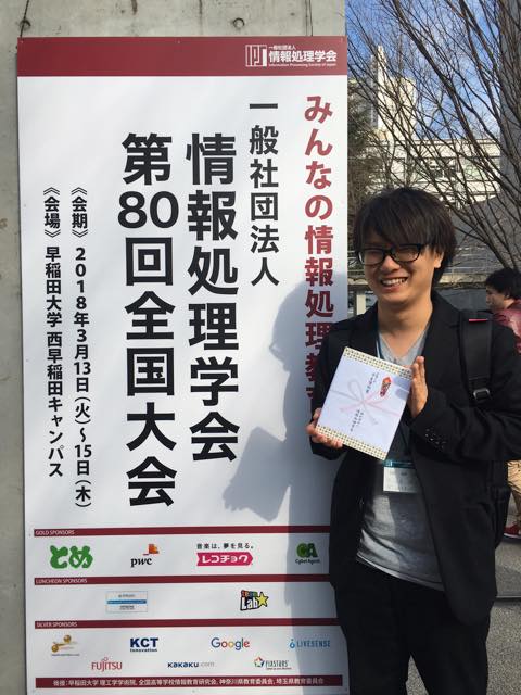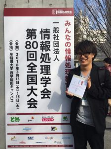 情報処理学会の第80回全国大会が、平成30年3月13日(火)~15日(木)の日程で、早稲田大学西早稲田キャンパスにて開催され、本学部B4白数紘之君(河合研究室)の研究発表が学生奨励賞を受賞しました。本大会は参加・発表者が1000名程で、情報処理分野では国内最大規模になるものです。