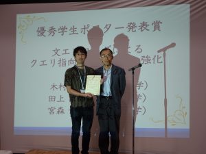 第12回 Webとデータベースに関するフォーラム(WebDB Forum 2019)が、2019年9月8日~9日の日程で、工学院大学にて開催され、先端情報学研究科 博士後期課程の木村 輔さん(宮森研究室)の発表論文が優秀学生ポスター発表賞を受賞しました。