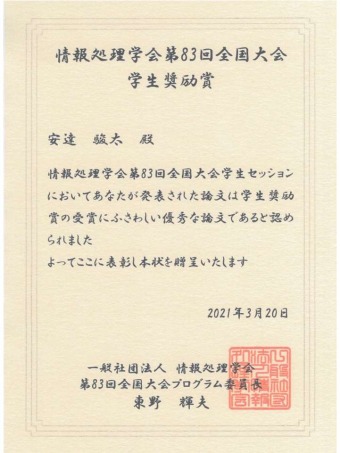 情報処理学会の第83回全国大会が、2021年3月18日(木)~20日(土)の日程で、オンライン開催されました。その中で研究発表した、安達駿太君(情報理工学部3年次・中島研究室所属)、工藤央一郎君(先端情報学研究科2年次・平井研究室所属)の2名が、それぞれの発表で学生奨励賞を受賞しました。(写真はM2工藤君のオンライン発表時の様子)