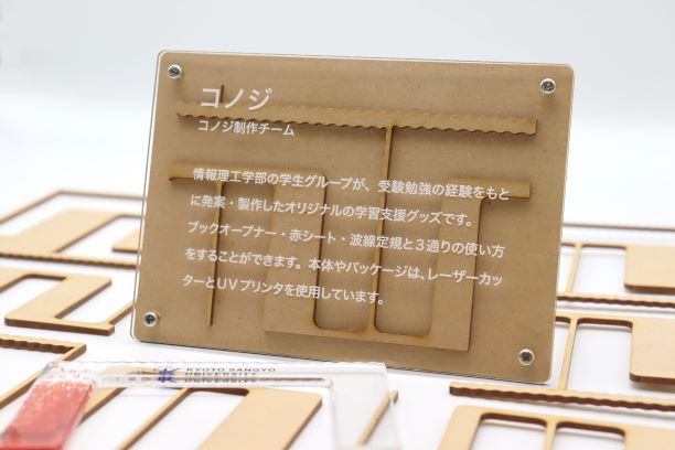 オンライン発表では、ファブスペースで作られた授業課題作品、伊藤慎一郎研究室の「鴨川デザインプロジェクト」、永谷直久研究室の「QuANTAM」、平井重行研究室の「CoolingPen」「人工大理石LEDタッチディスプレイ」といった研究のほか、ファブスペースプロジェクトでつくられたオリジナルグッズの紹介を行いました。紹介の際には、共通のハッシュタグ「#MFKyoto2021 #作品発表 #KSU_FabSpace」を記載しています。また、ファブスペースプロジェクトの一環で、有志学生がオンサイト用に製作していた展示什器(キャプション・看板)の紹介も行いました。