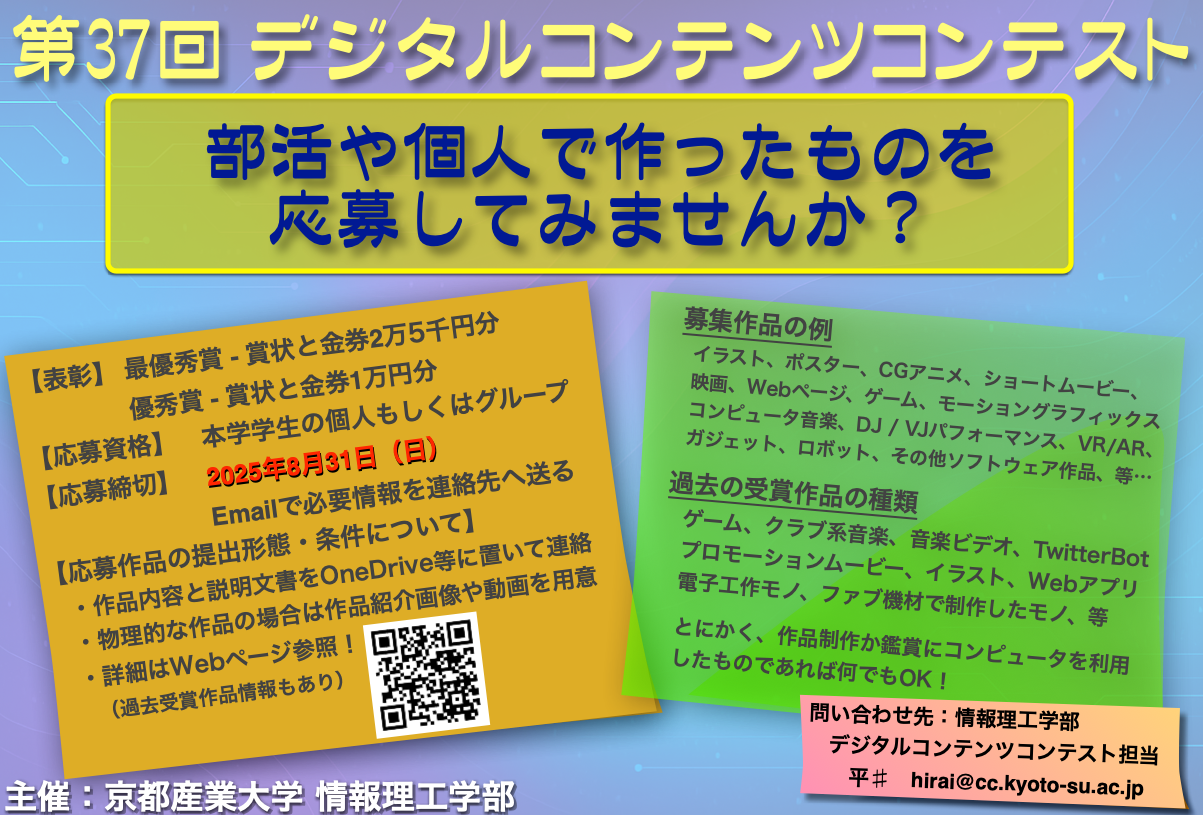 京都産業大学の学内向け作品コンテストについて、2025年度春学期の審査結果と作品募集情報を載せています。