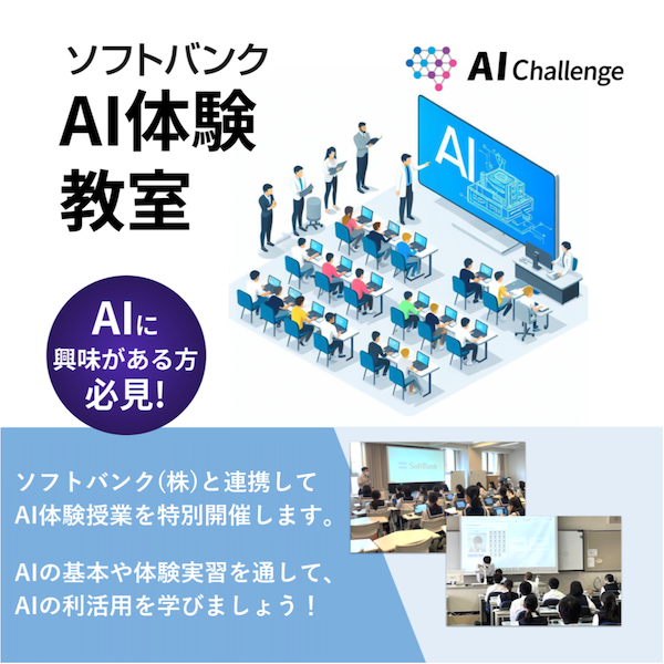 【14103 教室】 ソフトバンク特別授業「AI体験教室」 AIに興味がある方は必見!ソフトバンク(株)と連携してAI体験授業を特別開催します。AIの基本や体験実習を通して、AIの利活用を学びましょう。(※先着30名) |