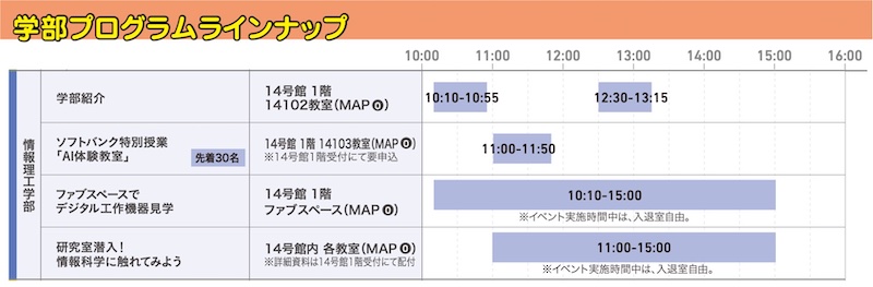 本学部の公開内容とそのスケジュールの概要資料です。興味ある分野や見たいものが具体的にある方は、14号館へお越しいただければ学部資料や公開内容の詳細情報が得られます。
