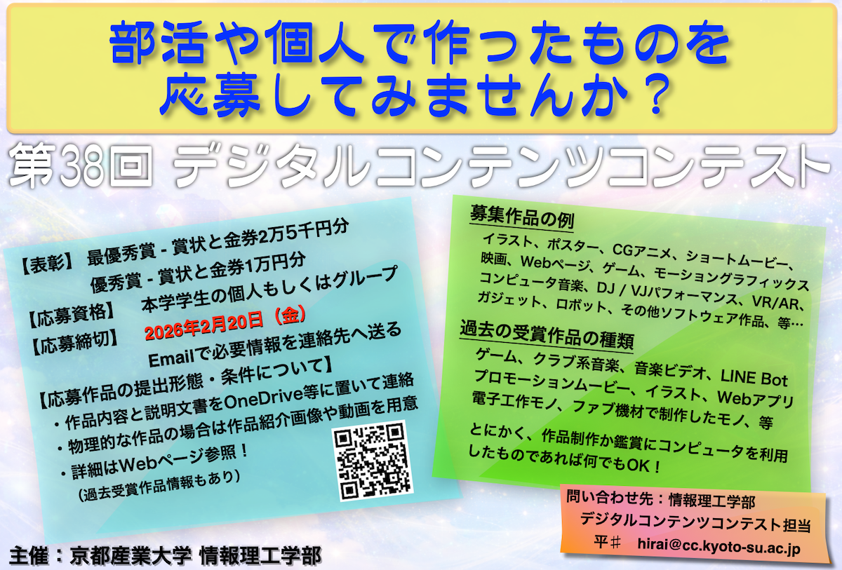 京都産業大学の学内向け作品コンテストについて、2025年度秋学期の作品募集情報を載せています。