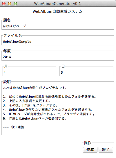 - 作品コンセプトや内容・制作過程の説明文書を紙面に印刷して付けて下さい(作成文書もCD-Rに収める)。この文書には、作品制作環境(マシン環境やソフトウェア等)も記載して下さい。また、その他の技術的な苦労、テクニックなどアピールポイントはいくら書いてもOKです。