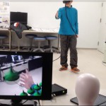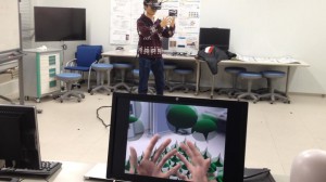 京都産業大学の14号館には、高精度な3次元動作解析システム(モーションキャプチャシステム)とヘッドマウントディスプレイ(HMD)を統合した「Mixed Reality(MR)システム」が導入されています。MRシステムでは、リアルな世界の中にゲームのようなバーチャルな世界の現象が入り混じった「複合現実感」(Mixed Reality) と呼ばれるディスプレイに映し出されているような映像を生成することができます(写真参照)。