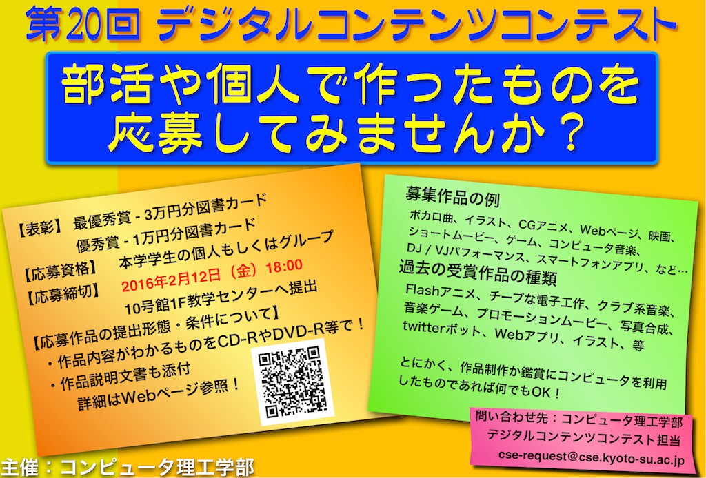 2015年秋学期実施のコンテストの審査結果と作品募集情報を載せています。