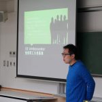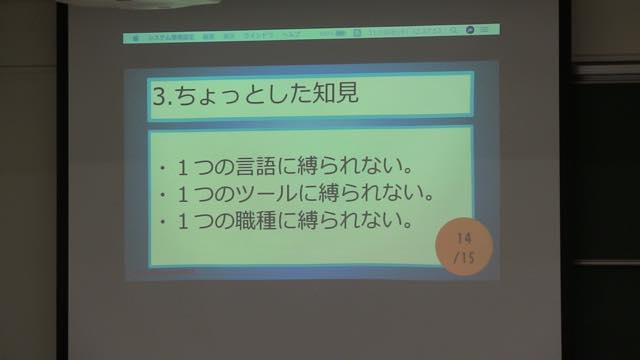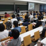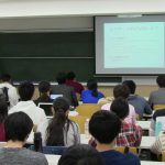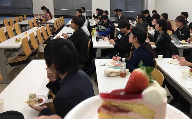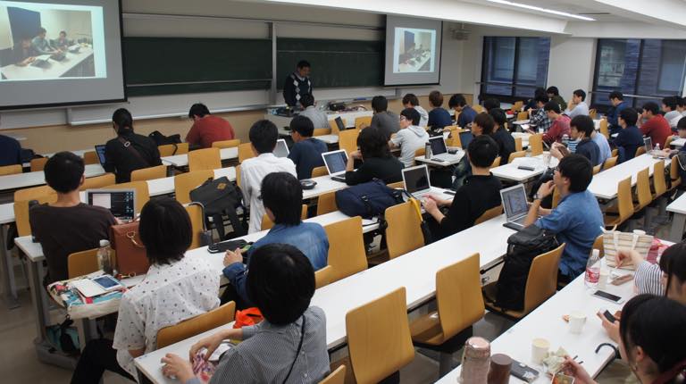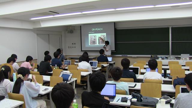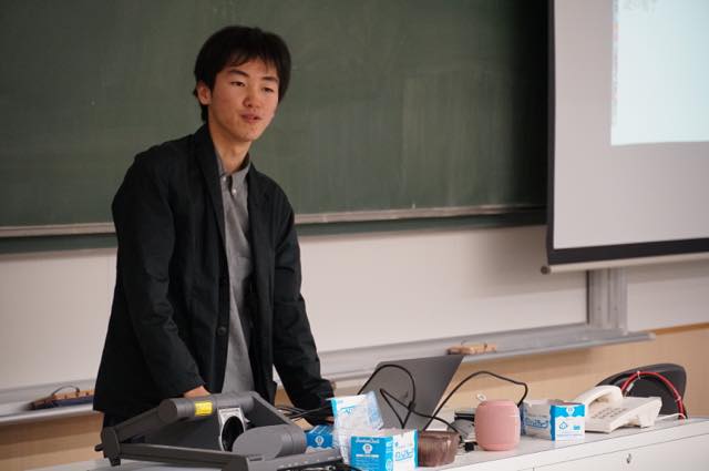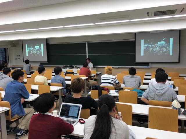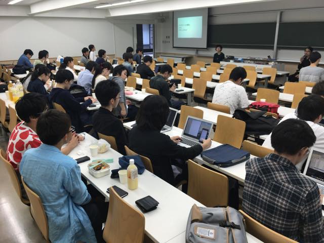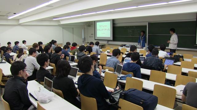 授業では直接扱わないような専門分野に関する様々なトピックの紹介や、デモ、学生LightningTalkなど、週に1回のイベントとしてランチタイムトークを行っています。2018年は、春学期・秋学期ともに金曜昼休みに、14102教室(14号館1F)にて行いました。ジュース類を提供しており、在学生はお弁当等を持って参加し(他学部学生でも参加OK!)、食事しながらトークを聞いて、質問などしてくれていました。