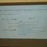 | 2019年7月12日 | VMとLinuxをインストールする会[説明資料pdf] (Virtual Machine環境としてVirtualBox ver. 6.0.8を、LinuxとしてUbuntu 18.04.2 LTSをインストール) |